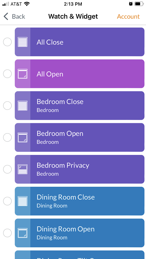 Note: Scene names may be shortened (truncated) in the widget display. The color shown for each Scene reflects the one chosen in the PowerView App—coordinating colors by room can help differentiate similarly named Scenes.