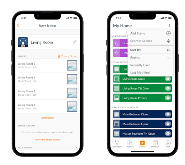 The screenshots below show how users can manage Rooms and Scenes directly within the PowerView App—even when using RemoteConnect: